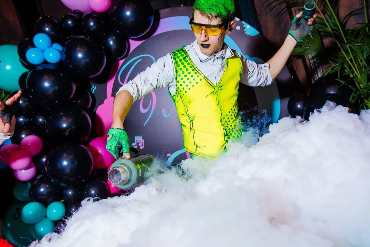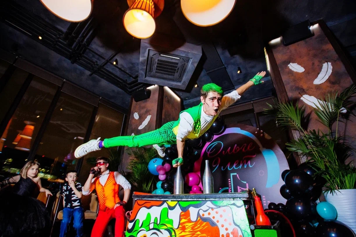 30 минут взрывного шоу от двух профессиональных артистов! Невероятные трюки с бутылками, акробатика, жонглирование, безопасный фейерверк, лазерное шоу и эффектный бумажный взрыв. Стильные декорации и костюмы в духе Pop Art, разработанные художниками Cirque du Soleil. В финале – 5 литровый фонтан лимонада, коктейль в ананасе для именинника, интерактивные игры и фотосессия!
