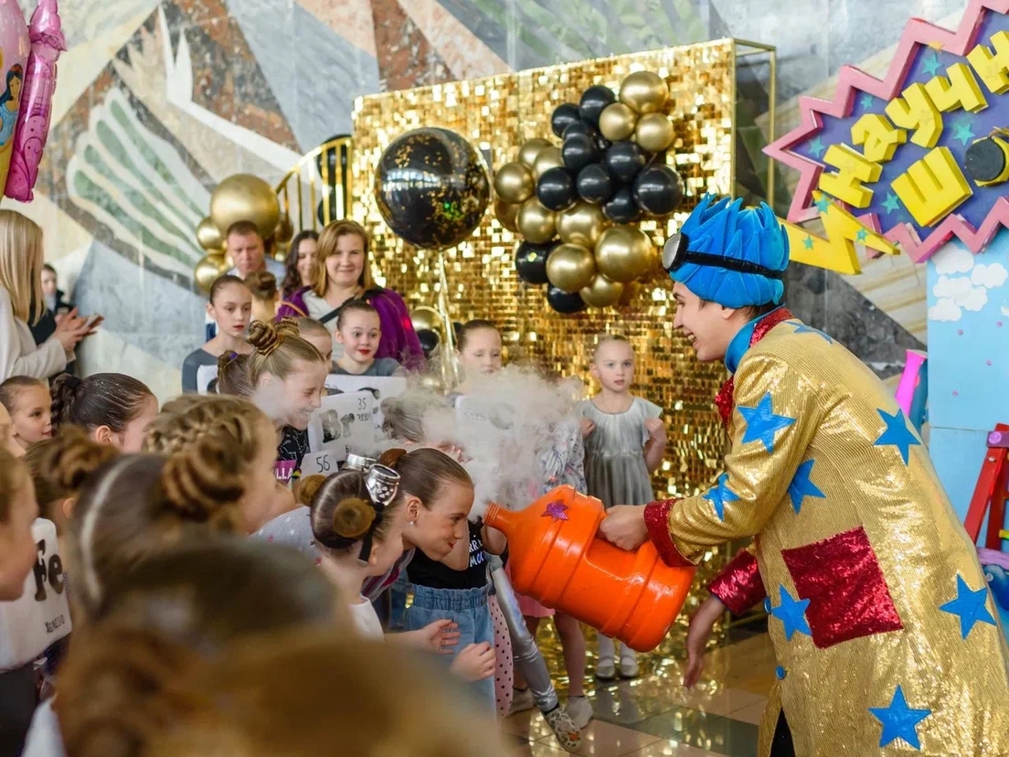 Декор: Уникальная фотозона в виде волшебной лаборатории, красочный передник на столе, большие бутафорские колбы и книги для детской фотоссесии, бочка для эффектного взрыва, тематическая селфи-пушка.