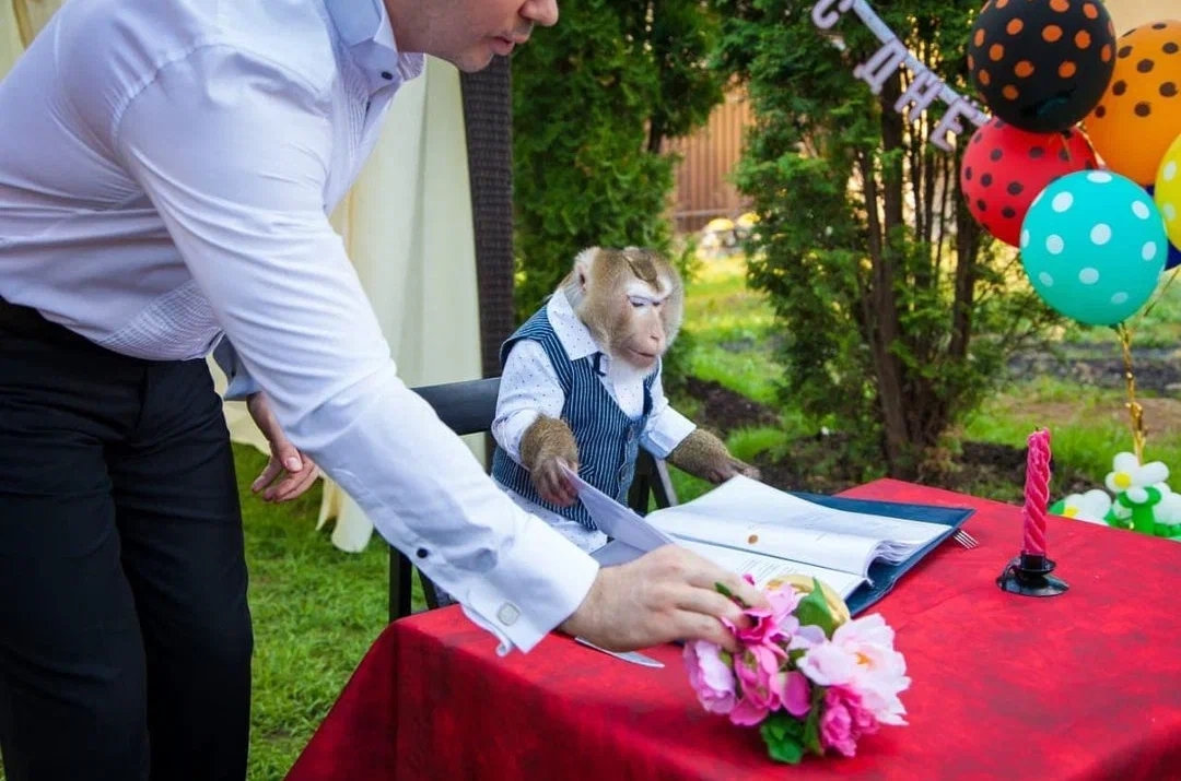 Vip гость приезжает специально для того, чтобы поднять бокал и поздравить изменника со знаменательным днем. Для обезьянки сервируют индивидуальный столик, предоставляют личного официанта. Необычный гость делает заказ и присоединяется к общему торжеству. В конце своего визита, необычный гость «поднимает» главный тост Вашего мероприятия. На детском празднике покажет уроки этикета и покажет как следует вести себя за столом.