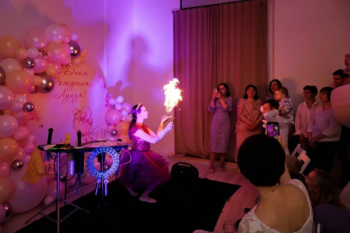 Музыкальное и световое оформление, завораживающие трюки на световом столе (карусель, вулкан, цветок, башня и т.д.) взлетающие вверх белые пузыри, гигантские кольца, огненные, дымные пузыри, интерактив с гостями, погружение в огромный мыльный пузырь для всех желающих и многое другое.